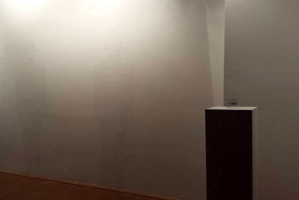 The work with its size and concept idea reflects the problem of language as a human construction and traps the: (in) significance, (non) sound, and the (un) importance of one’s voice. Of one’s words.